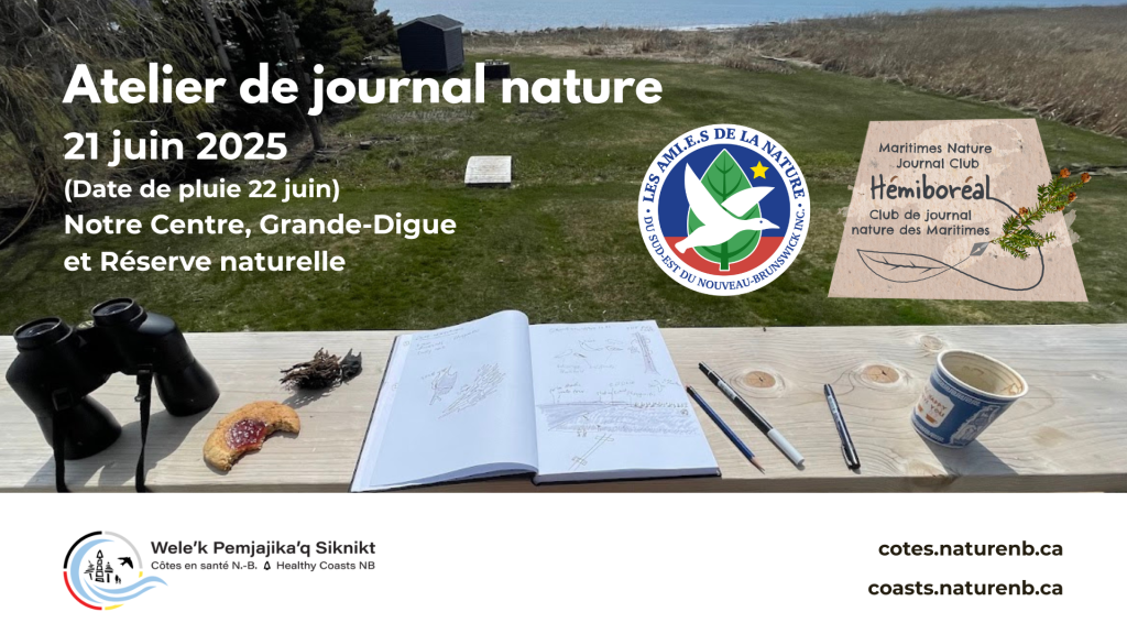 Rejoignez-nous pour une matinée d’exploration, d’observation et de créativité en nature dans le cadre du programme Côtes en Santé NB. Cet atelier vous initiera à la pratique du journal nature, une activité qui allie science, écriture, art, et pleine conscience. Aucune expérience artistique requise!